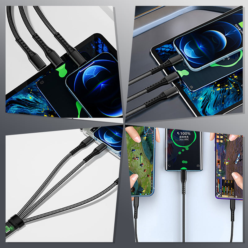 כבל טעינה 3 ב-1 - כבל זה מאפשר לכם לטעון מספר מכשירים בו זמנית, חוסך לכם זמן ומבטל את הצורך בכבלים מרובים. בין אם יש לכם אייפון, אנדרואיד או מכשיר מסוג C, כבל זה מכסה אתכם, ומבטיח טעינה יעילה ללא האטות.