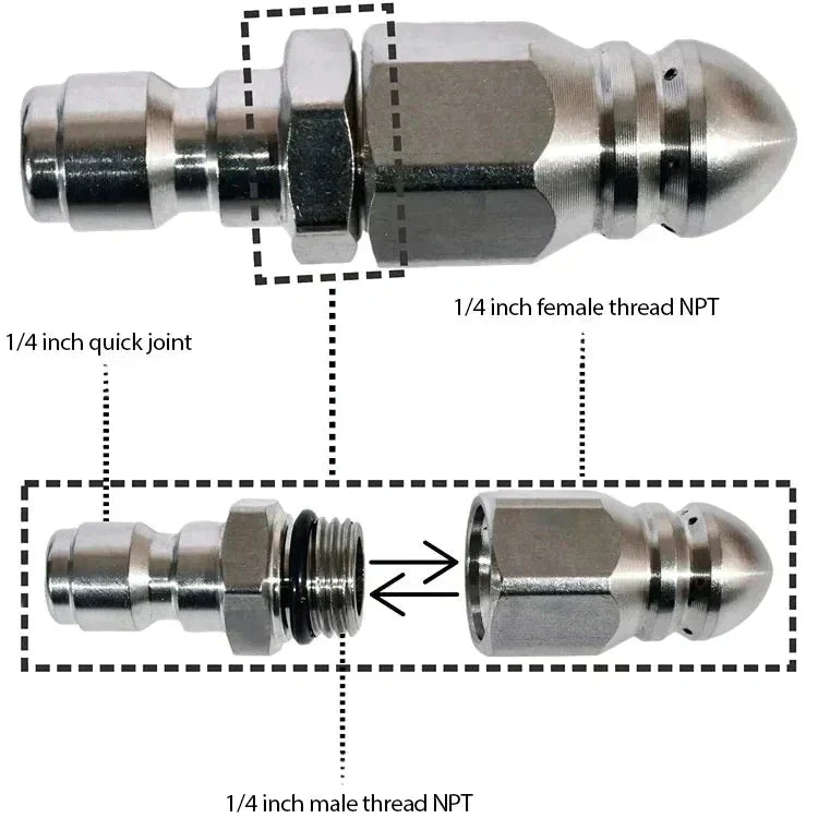 נירוסטה עמידה - מעוצבת מפלדת אל חלד באיכות גבוהה, זרבובית זו בנויה כדי להימשך. זה יכול לעמוד בקפדנות של מים בלחץ גבוה ואתגרי ניקוי הצינורות. הבנייה העמידה מבטיחה שהיא תישאר במצב מצוין גם לאחר שימושים מרובים.